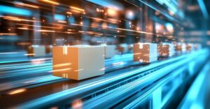High-speed conveyor system moving packages through a modern fulfillment center for rapid order processing and efficient logistics.