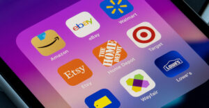 Smartphone screen showing popular retail and e-commerce apps including Amazon, Walmart, Target, Lowe’s, Best Buy, Etsy, Wayfair, eBay, and Home Depot, representing retailers expanding into major third-party marketplace platforms.
