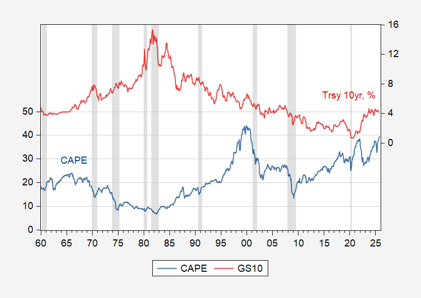 Figure 1: Standard and Poor Cyclically Adjusted Price Earnings (CAPE) ratio (left scale), and ten year interest rate (right scale). Source: Robert Shiller, accessed 10/10/2025