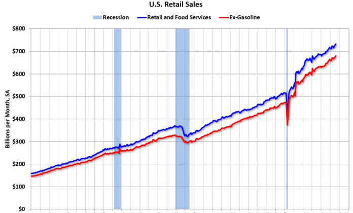 This graph shows retail sales since 1992. This is monthly retail sales and food service, seasonally adjusted (total and ex-gasoline).