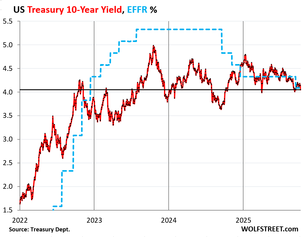 The 10-year Treasury yield, for example — now barely above 4% as of Friday evening (bond markets are closed today) — has been on a downtrend this year and has been roughly in the same range for three years:
