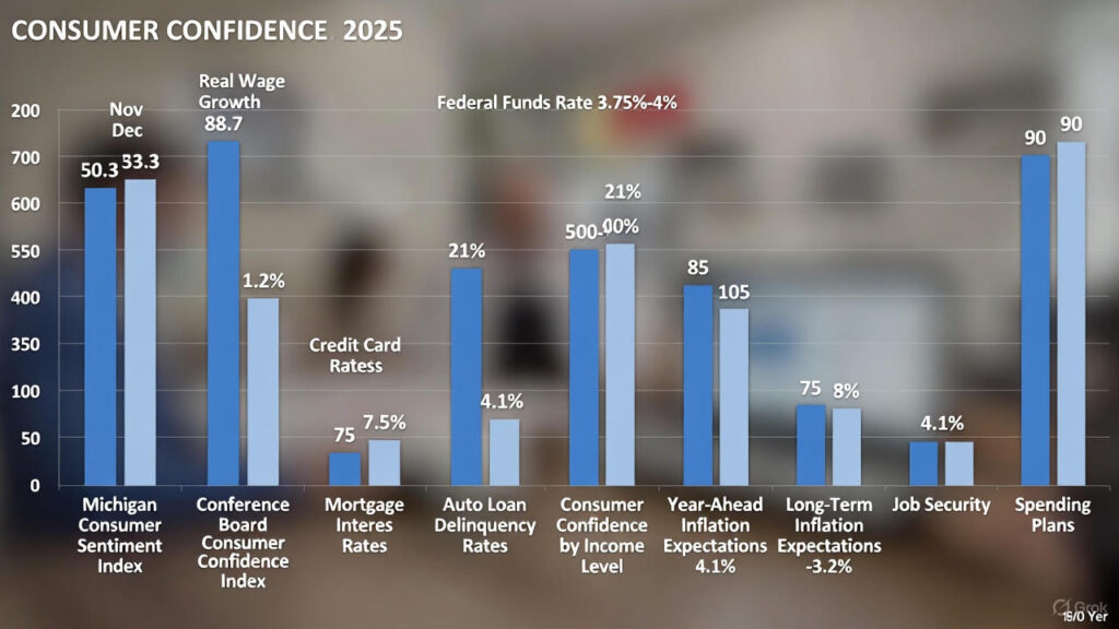 The job market stabilized late-year: unemployment at 4.4% (up from 4.1% in 2024 Q4), but claims hit three-year lows at 191K in late November. Hiring slowed (119K jobs in September), yet low layoffs signal “no-hire, no-fire.” Future income expectations? Down 10%, with 30% citing wage stagnation amid 1.2% real growth. High earners bucked the trend, up 5% on stock highs, but overall, sentiment signals recession fears—worse than 2024’s optimism.