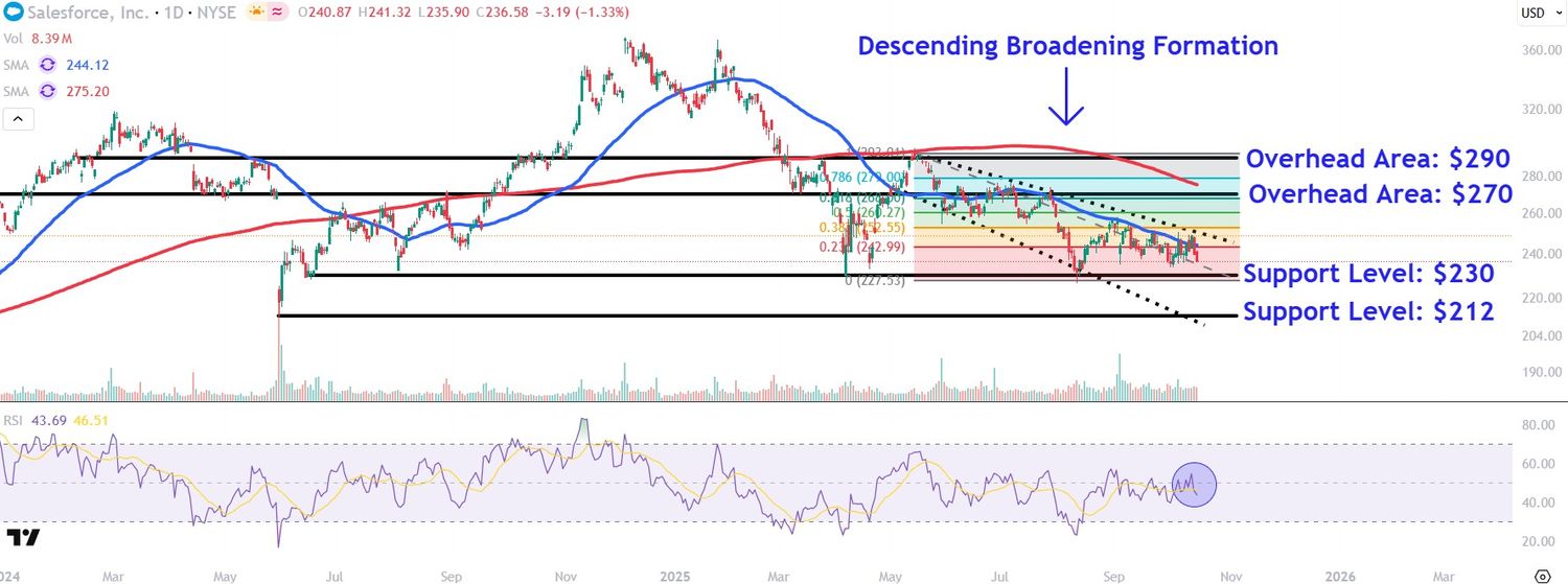 • Investors should watch critical overhead areas on the Salesforce chart around $270 and $290, while also monitoring support levels near $230 and $212.